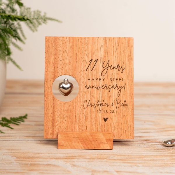 11th Anniversary Gift, Eleventh Steel Anniversary Card, 11 Steel Heart Wedding Custom Wood Engraved Card, Laser Cut Wood Gift for Him & Her.