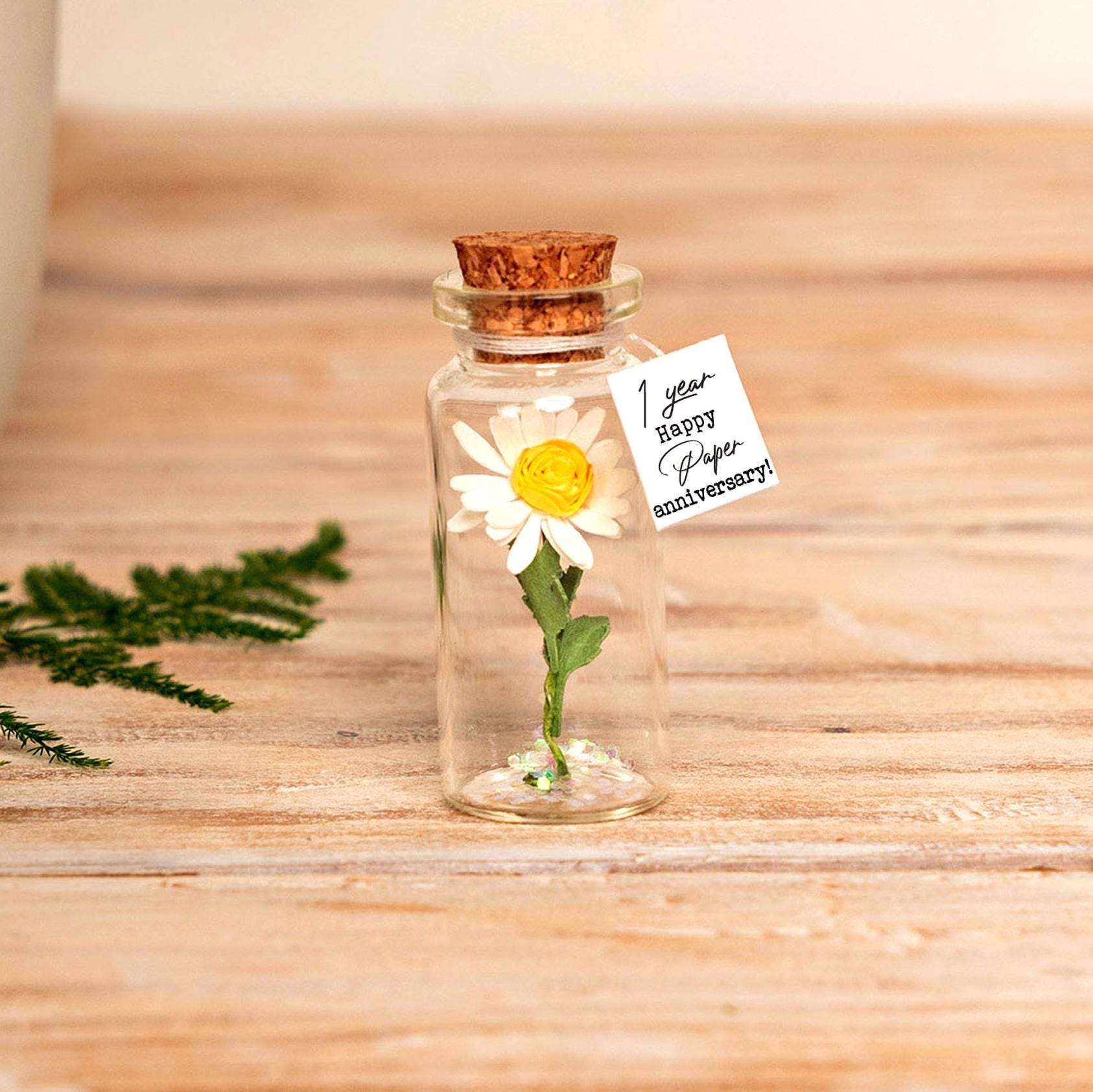 1st Paper Anniversary Miniature Gift, 1 year Wedding Anniversary, photo, Handmade Paper Flower, Mini Daisy Bottle Personalized Romantic Gift is the perfect 1st anniversary gift to celebrate your paper anniversary. This handmade memento features paper flowers and delicate flower art in a mini daisy bottle alongside your photo collage, making it an ideal photo gift and gift for her.