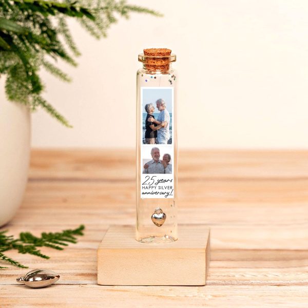 25th Silver Anniversary Gift, Sterling Heart Charm Bottle with Photo Collage, Personalized 25 Year Anniversary Keepsake & Custom Photo Gift shines as a modern silver anniversary tribute. The silver heart charm gleams within its bottle, surrounded by your smiles in a stunning photo collage—perfect for personalized gift moments. Celebrate your 25 year anniversary with this 25 silver present, crafted as a heartfelt anniversary gift for couples or gifts for boyfriend, complete with an anniversary card to mark this sterling charm milestone.
