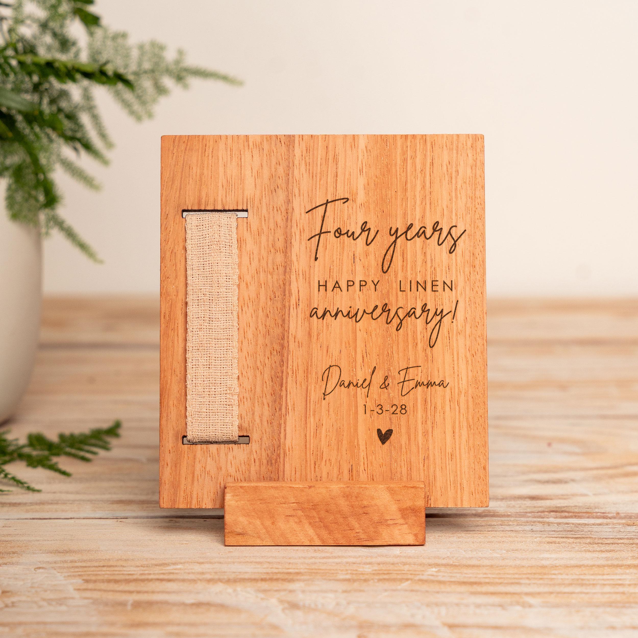 4th anniversary gift, Linen Anniversary Gift, Custom Wood Card with Engraved Message and Linen Gift, Personalized Fourth Year Wedding Present for Couples or Her.