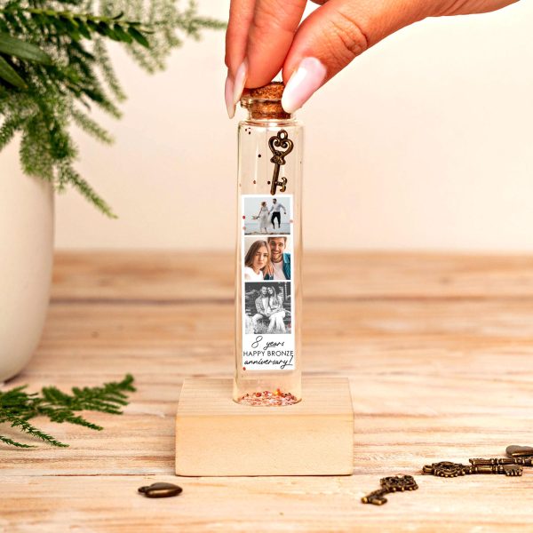 8 Years Bronze Anniversary Gift, Bronze Key Bottle with Photo Collage Art, Personalized Anniversary Card, Wedding Gift for Her & Him, Key celebrates your bronze anniversary in style. This 8th anniversary gift is a true bronze gift and 8 bronze anniversary keepsake, featuring a delicate bronze key charm suspended in a mini bottle alongside your favorite snapshots in a stunning photo collage art design. Perfect as a wedding anniversary or thoughtful gift for her, it doubles as a personalized gift and standout anniversary gift. Add your custom photo gift to create a meaningful anniversary card that you’ll treasure forever.