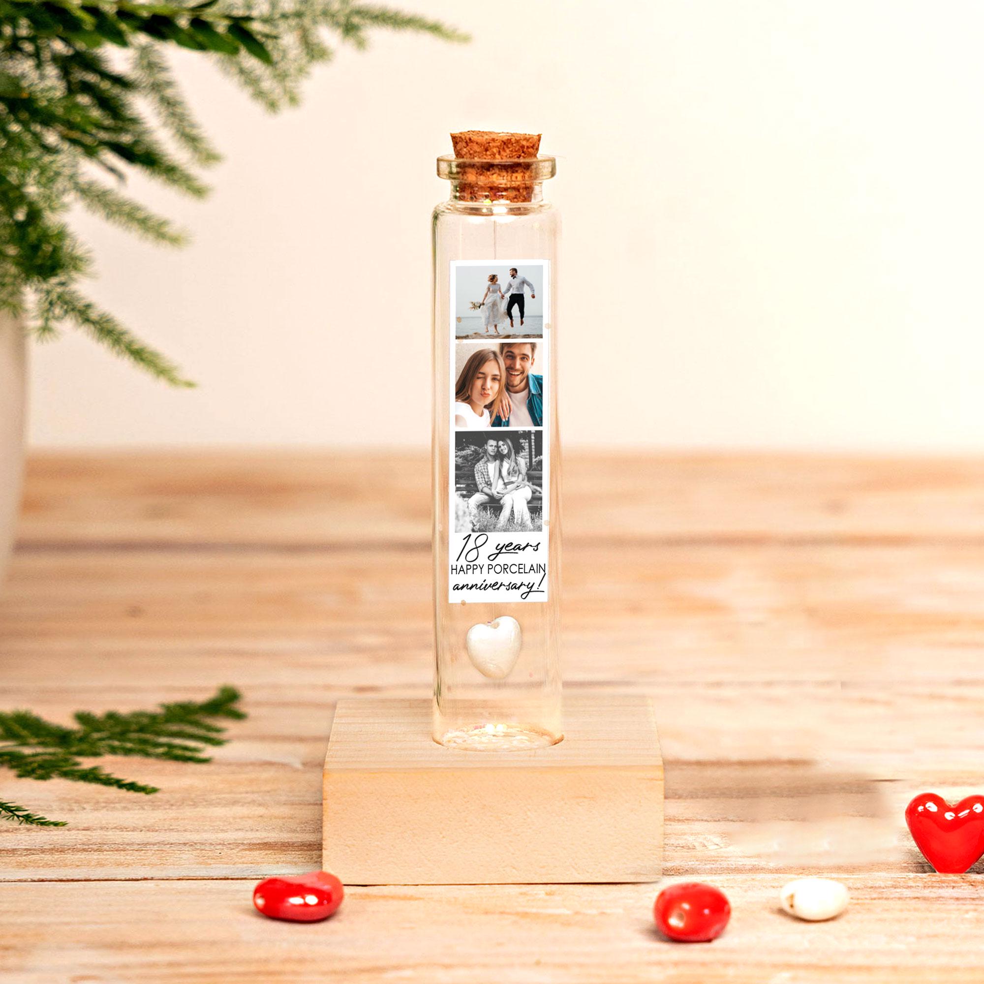 Porcelain Gift, 18th Anniversary Gift, Ceramic Heart Bottle with Photos, Personalized 18 Year Anniversary Keepsake Custom Photo Gift for Him brings elegance to your 18th milestone. This porcelain gift features a delicate ceramic heart suspended in glass, paired with your chosen photos for a truly personalized gift.